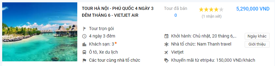 Là nền tảng đặt tour du lịch trực tuyến hợp tác với nhiều đơn vị uy tín, các tour Phú Quốc được cung cấp trên website Etrip4u rất đa dạng về hình thức và mức giá. Tại đây bạn sẽ dễ dàng lựa chọn được lộ trình mà mình mong muốn, từ trải nghiệm, thám hiểm đến du lịch sinh thái...Với đội ngũ nhân viên nhiệt tình, có chuyên môn cao, Etrip4u luôn tạo được sự hài lòng, thoải mái cho mọi khách hàng.