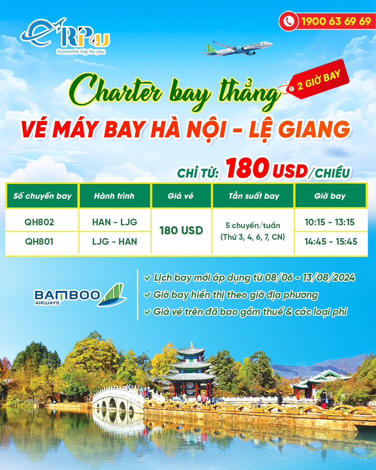 Bạn đang mong muốn khám phá Lệ Giang - thành phố cổ kính, thơ mộng của Trung Quốc? Bamboo Airways hiện đang mở đường bay Hà Nội - Lệ Giang, chương trình bay charter thẳng với giá vé siêu ưu đãi, giúp bạn tiết kiệm thời gian và chi phí cho hành trình của mình. Đặc biệt, giá vé siêu rẻ, chỉ từ 180 USD/chiều (đã bao gồm thuế, phí).
