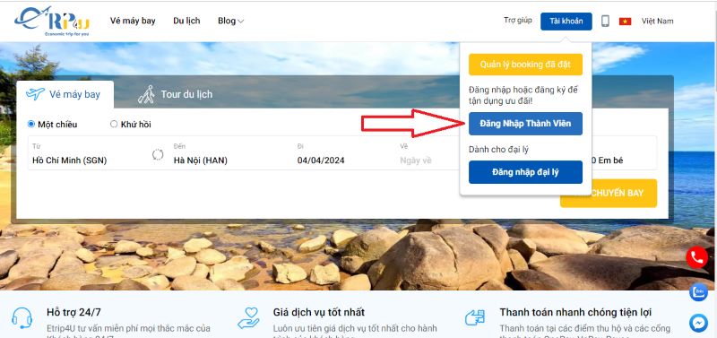 - Bước 1: Đăng nhập vào tài khoản cá nhân trên Etrip4u.com