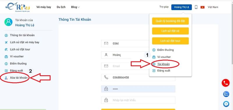 Sau khi ấn đống ý, website sẽ tự động xóa tài khoản và đăng xuất khỏi tài khoản của quý khách. Nếu muốn đăng ký lại, quý khách có thể đăng ký lại tài khoản khi cần. Nếu cần thêm thông tin hoặc hỗ trợ, quý khách vui lòng liên hệ với Etrip4u.com qua các kênh sau và nêu rõ yêu cầu của mình: