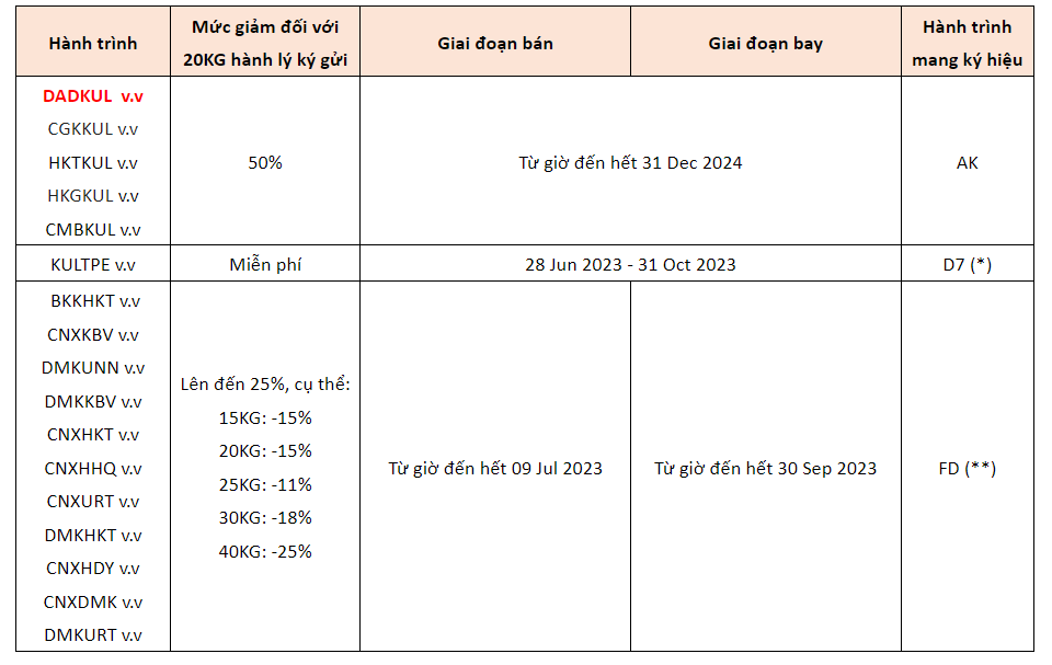 - Chỉ áp dụng cho chuyến bay ký hiệu AK, FD tương ứng đối với các hành trình nêu trên và D7 đối với hành trình KULTPE v.v