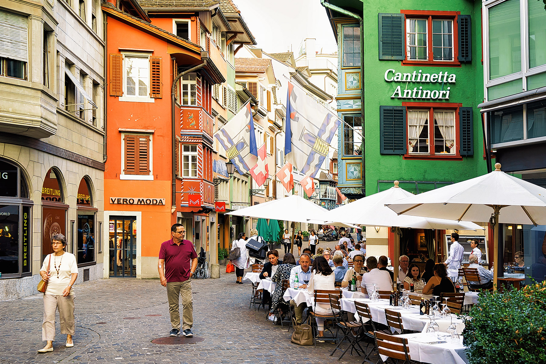 Dạo quanh khu phố cổ, du khách sẽ cảm nhận nét quyến rũ của Zurich, hay dừng chân tại các quán cà phê và nhà hàng bên đường để thưởng thức những đồ ăn tuyệt vời của thành phố.