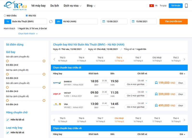 Bước 2: Lựa chọn tìm vé khứ hồi hay một chiều, sau đó điền các thông tin như: điểm đi là Buôn Mê Thuột, điểm đến Hà Nội, ngày đi, ngày về, số lượng người đi. Sau đó ấn “Tìm chuyến bay”.