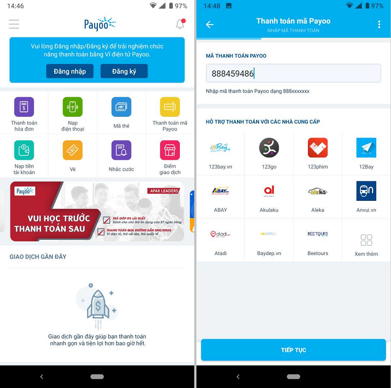 - Bước tiếp theo, khách hàng truy cập vào app Payoo, đăng nhập tài khoản và lựa chọn mục "Thanh toán mã Payoo". Tại đây, khách hàng nhập mã thanh toán Payoo đã được Etrip4u cung cấp trước đó và hoàn thành các bước tiếp theo như hướng dẫn là xong.