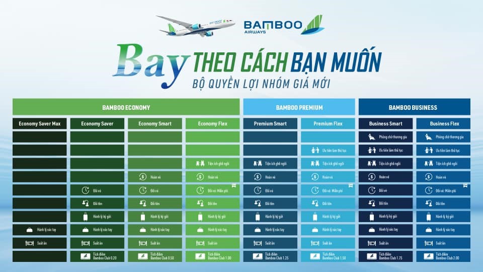 Nếu như trước 25/10, hành khách của Bamboo Airways chỉ có 3 hạng vé để lựa chọn: Bamboo Eco, Bamboo Plus, Bamboo Business thì giờ đây với 8 nhóm vé với tiêu chí linh hoạt, đa dạng và tiết kiệm hơn sẽ mang đến những trải nghiệm tốt nhất cho tất cả hành khách.