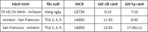 TP Hồ Chí Minh - San Francisco (transit tại Incheon - kết hợp cùng hãng hàng không Asiana Airlines)