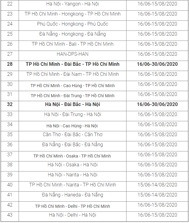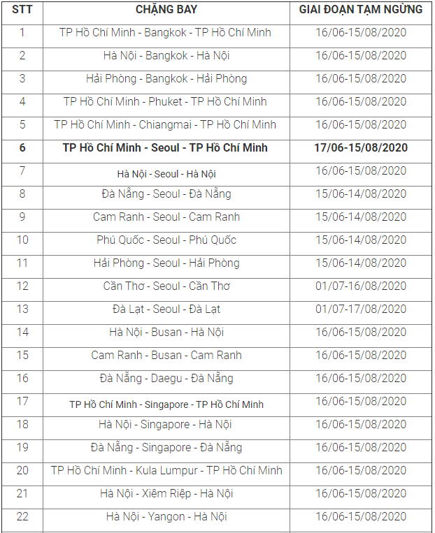 Riêng đối với chặng bay TP Hồ Chí Minh/ Hà Nội - Đài Bắc - TP Hồ Chí Minh/ Hà Nội (SGN/HAN-TPE-SGN/HAN), thời gian tạm ngừng sẽ đến 30/06/2020 cho đến khi có thông báo tiếp theo.