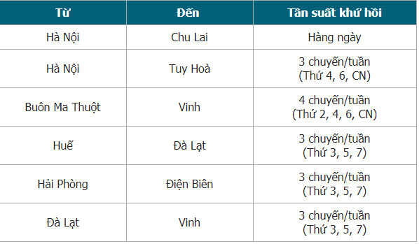 Các đường bay: Hà Nội – Chu Lai/Tuy Hòa, Vinh – Buôn Ma Thuột, Hải Phòng – Điện Biên, Đà Lạt – Vinh/Huế