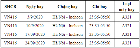 Hãng hàng không Vietnam Airlines vừa thông báo lịch bay Hà Nội - Incheon (HAN-ICN) trong tháng 9/2020, quý khách vui lòng xem tại bài viết sau để nắm lịch bay chi tiết.