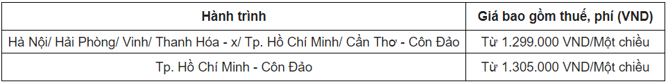 - Mức giá ưu đãi áp dụng cho hành trình từ Hà Nội/Hải Phòng/Vinh/Thanh Hoá đến Côn Đảo nối chuyến tối đa 6 tiếng tại Tp.Hồ Chí Minh/Cần Thơ chỉ từ 435.000 VNĐ/ chiều (tương đương 1.299.000 VNĐ/chiều bao gồm thuế, phí).